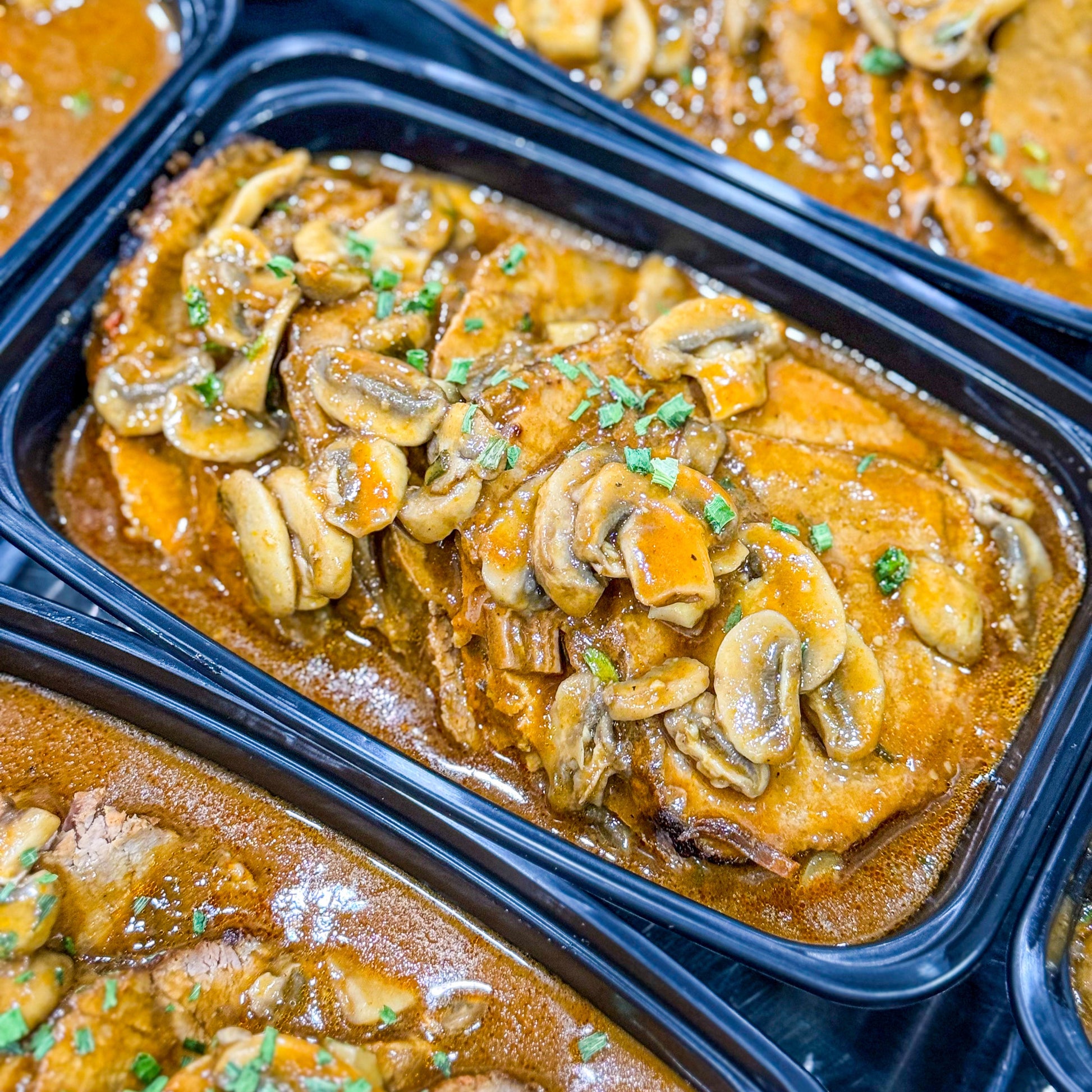 Ingredientes: Carne de boi, molho madeira e cogumelos.
