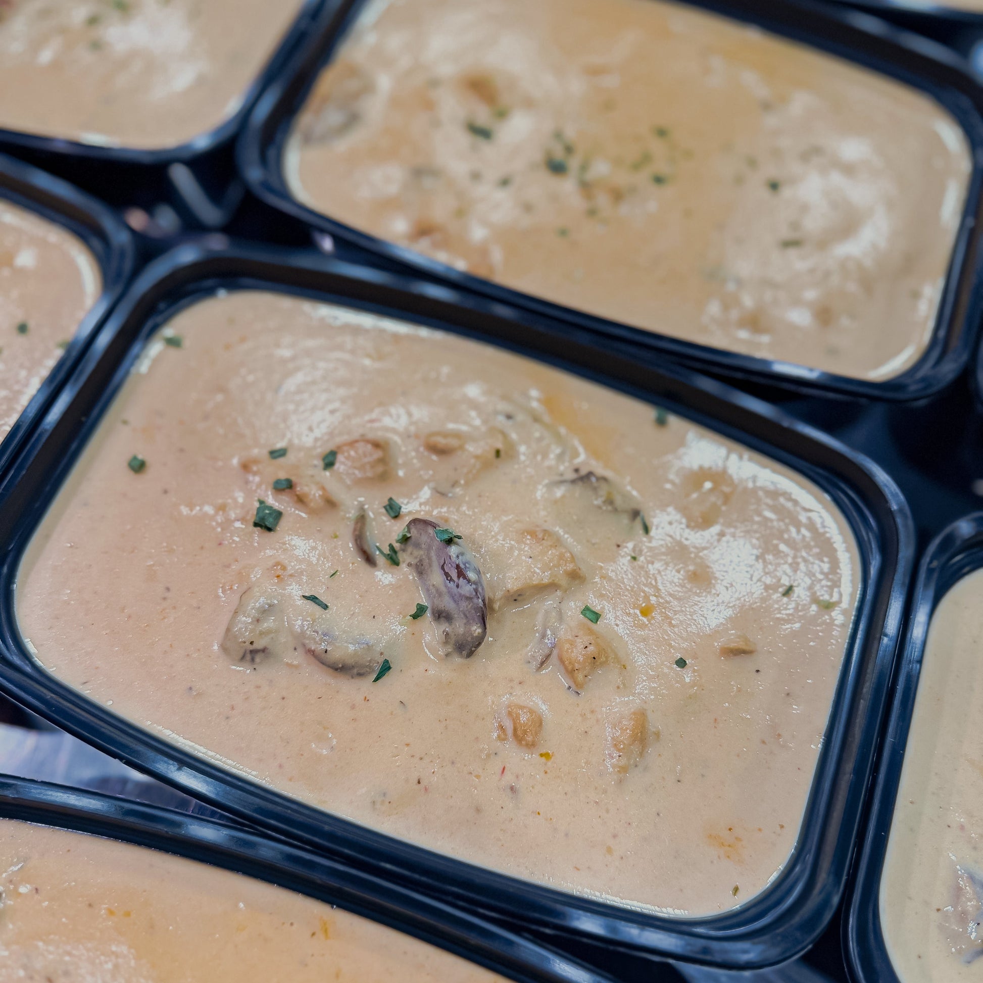 Ingredientes: Frango, creme de leite fresco, molho de tomate, ketchup, mostarda, soy sauce, cogumelos.