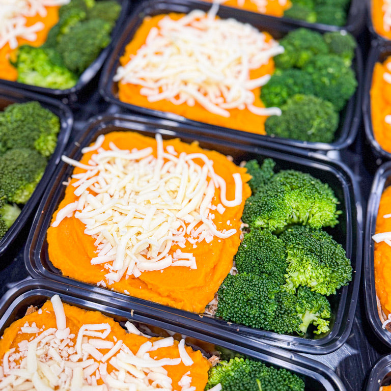 PRONTA ENTREGA, MENU SAUDÁVEL, MARMITA CONGELADA- Escondidinho de frango desfiado com purê de batata doce laranja e queijo low fat e brócolis no vapor