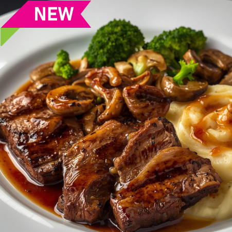 SAUDÁVEL REGULAR - Tiras de alcatra ao toque oriental com cogumelos e brócolis e purê de batatas