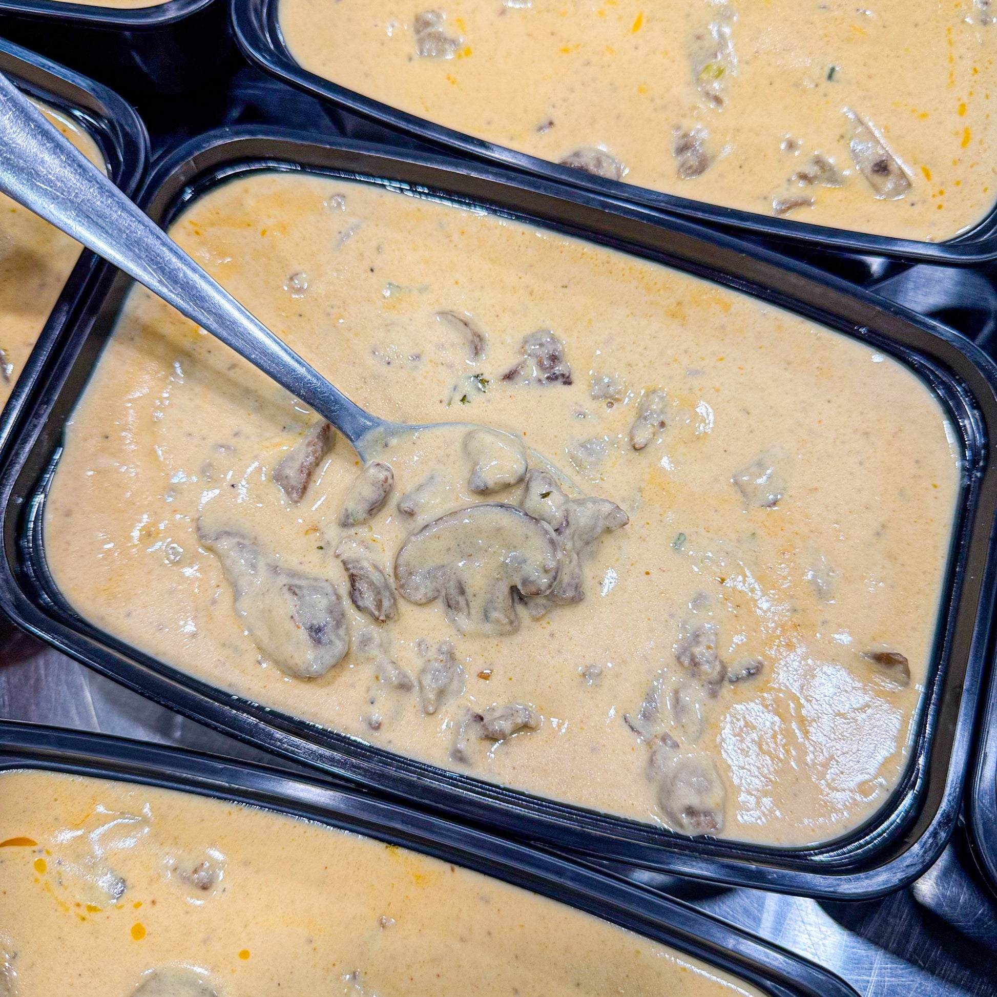Ingredientes: Carne, creme de leite fresco, ketchup, mostarda, shoyu, cogumelos.